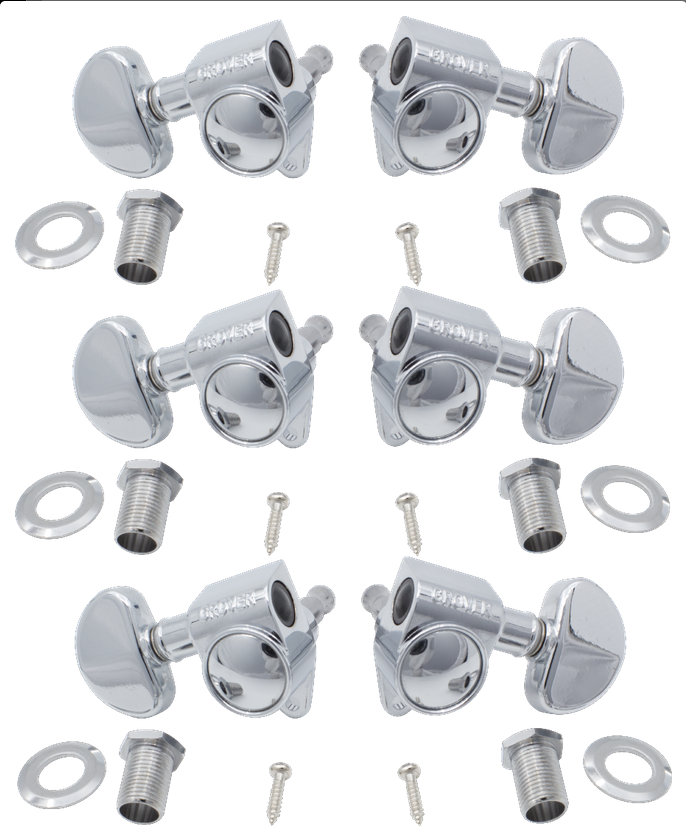 These guitar machines are a triumph in engineering and styling. The housing provides a maximum bearing for worm, gear and string post. Gear ratio is 14:1. Worm and gear are precision-cut for perfect meshing. This eliminates backlash and slippage. Countersunk tension screw permits player to regulate turning tension to any degree. Gear box has a special lubricant for lifetime, trouble-free service. Includes 5/8” washers, bushings and wood screws.