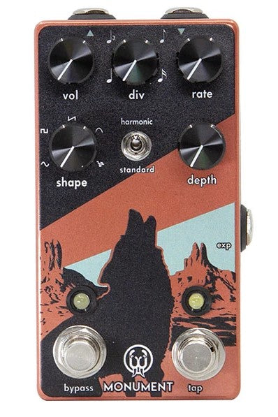 Inspired by the beautifully jagged, red-sand desert landscape of Monument Valley, the Monument Tremolo is both a harmonic, and standard tremolo that produces a rich, luscious, warm pulsating modulation capable of peaks and valleys as smooth or as jagged as the real ones that our dear mother nature created long ago.