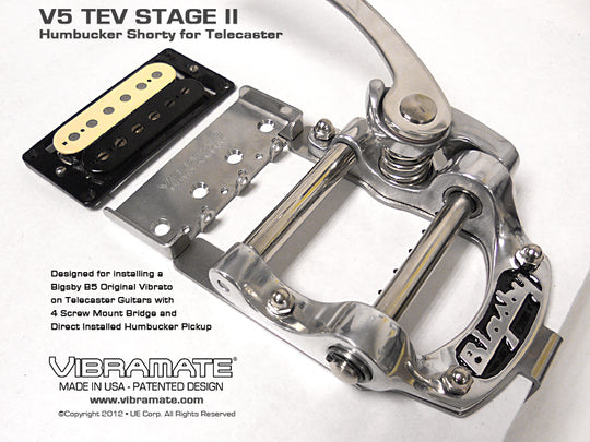 Vibramate V5-TEV Stage II with Shorty Ash-Tray Bridge option. Now you can install a Bigsby Vibrato on your vintage Telecaster® guitar without drilling any holes! The Vibramate V5-TEV Stage II Model Mounting Kit is designed for...Regular price $175.00Regular price $175.00