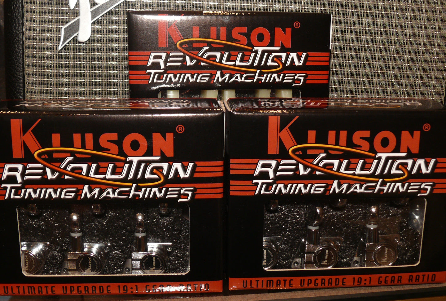 The Kluson® Revolution F-Mount 19:1 gear ratio tuning machine set. These state of the art, lightweight, diecast tuning machines are designed to directly retrofit the stamped "F" tuning machines that Fender® uses on reissues of models from the CBS/Fender® era currently being produced. We have added our three staggered-post feature to the Revolution F-mount tuning machine set to give you the proper string break over the nut. This allows you to bypass the string trees, reducing the number of friction points for better tuning stability while using the tremolo bridge or bending notes and gives a cleaner look to the headstock. On the non-locking model we have kept the original Kluson® Safe-Ti-Posts to keep those sharp string ends out of the way.