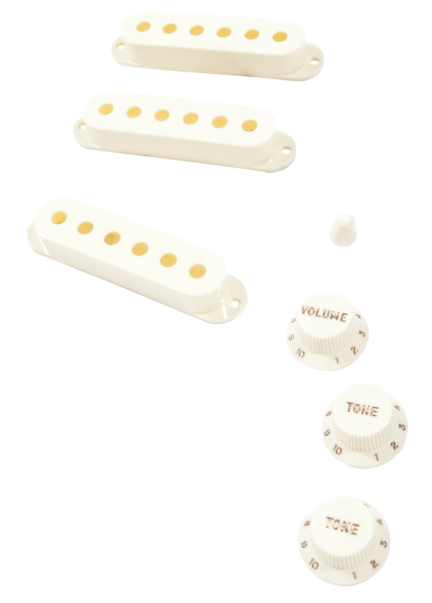 - Includes vintage white tone and volume knobs, pickup covers, tremolo arm tip and switch tip